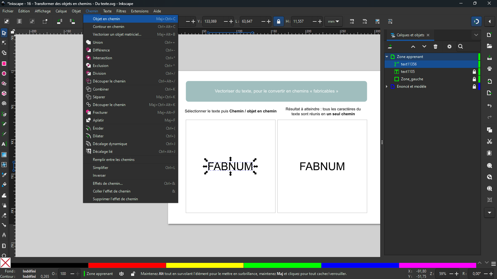 - Convertir un texte en chemins avec la commande Objets / Objet en chemin